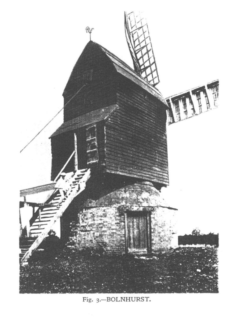 Bolnhurst Mill stood at Wood End, half a mile from the cross-roads, and is shown on the Bryants map 1825/26. The photograph was taken about 1915. The shape of the wooden milling portion was unusual, where the lower story had a lean-to, which enlarged that floor.